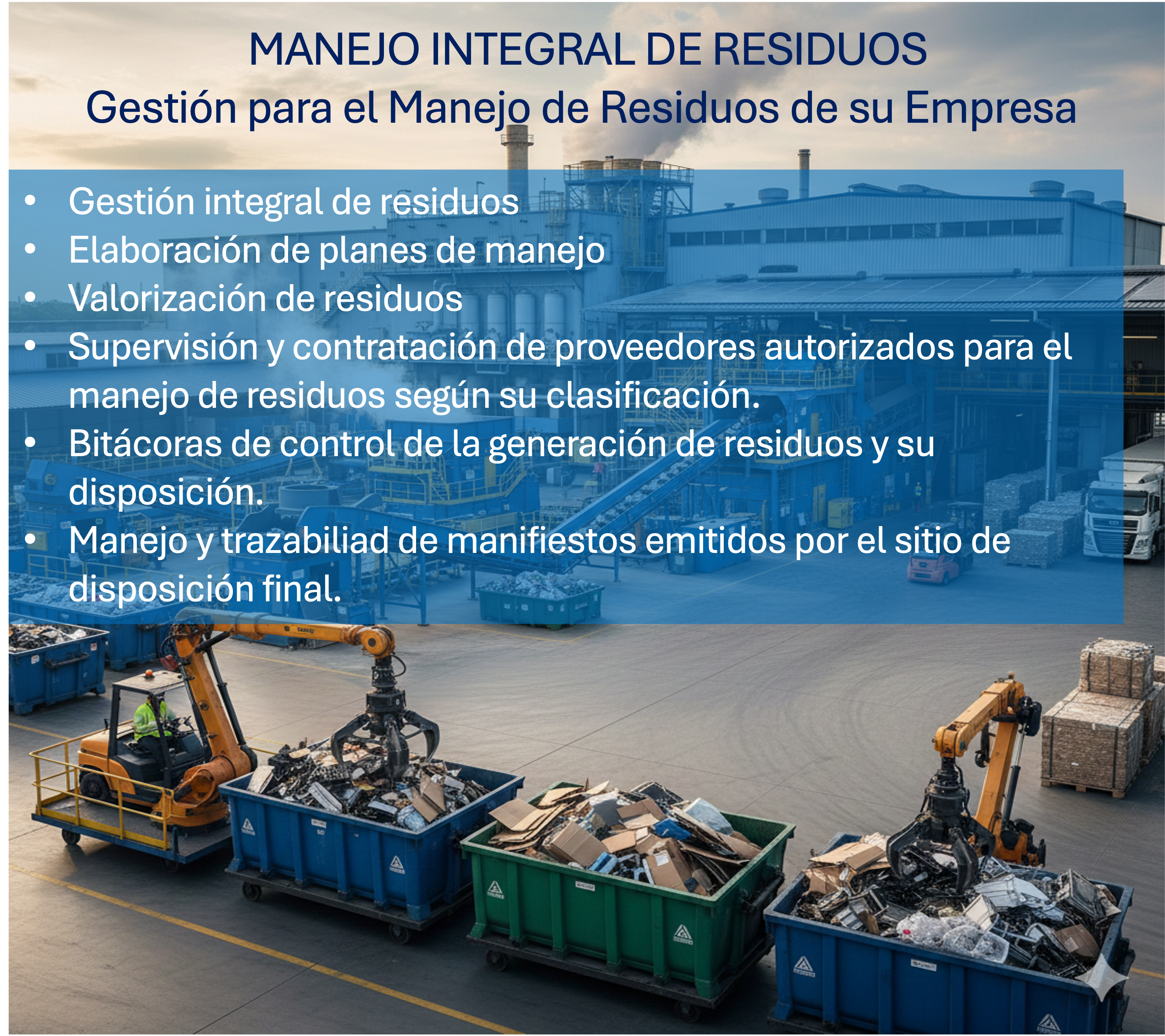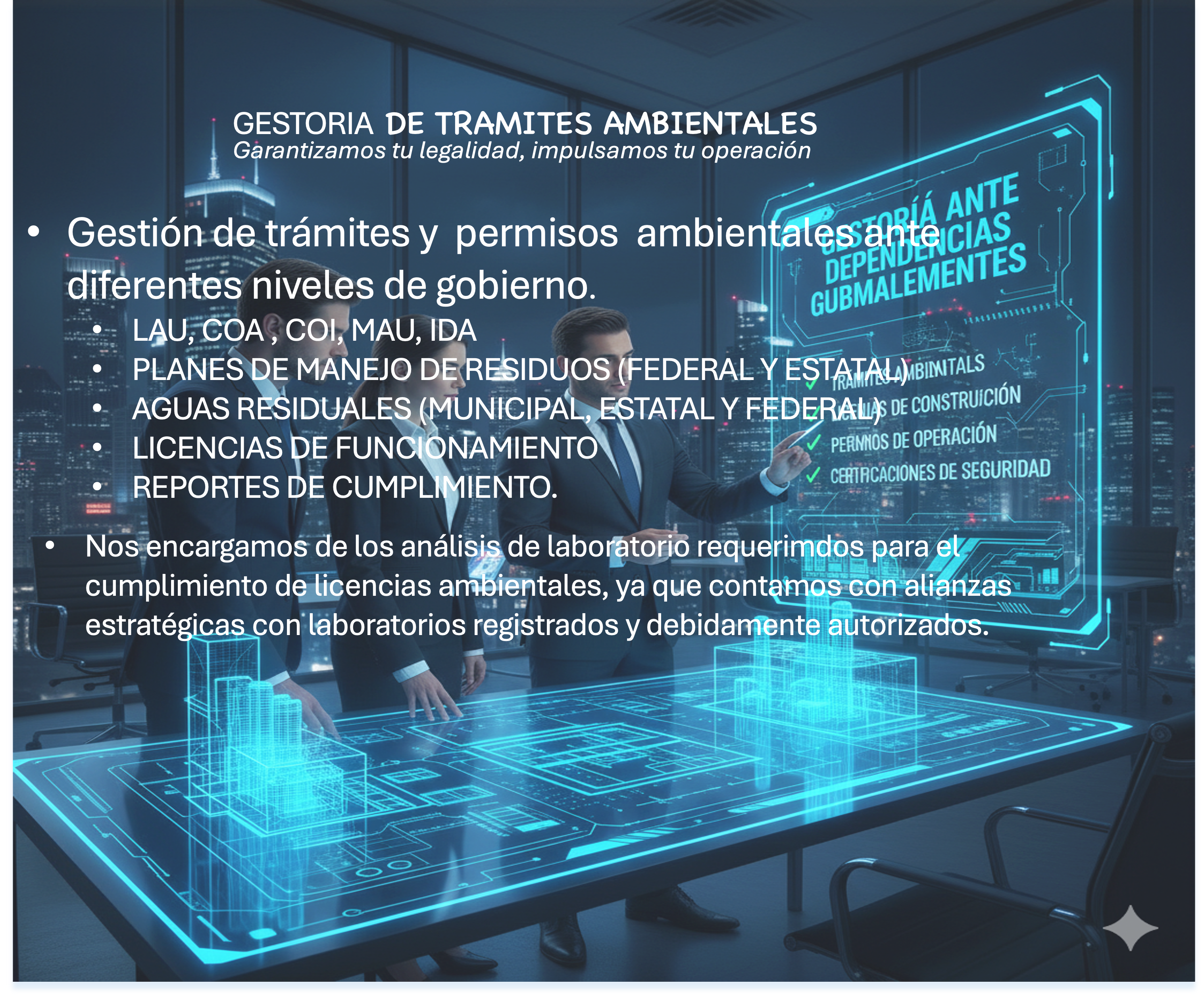 En PROAMBISA, brindamos soluciones integrales para optimizar y asegurar el cumplimiento normativo en aspectos ambientales, seguridad y salud en el trabajo. Nuestra experiencia abarca la gestión de permisos, auditorías, capacitación, elaboración de procedimientos, y diseño de planes enfocados en la sostenibilidad y economía circular.